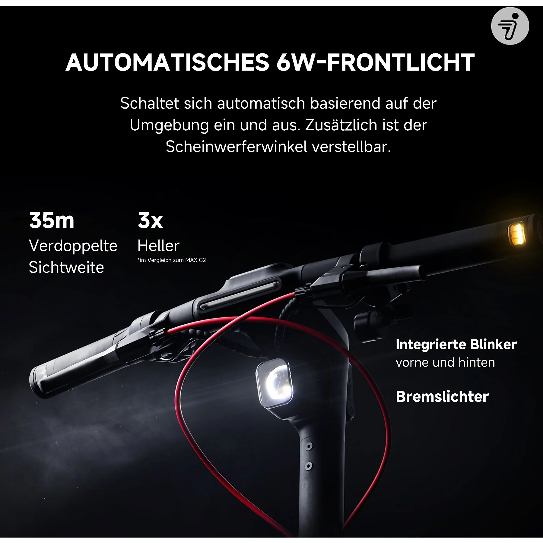 Leistungsstarke Beleuchtung und Blinker sorgen für beste Sichtbarkeit bei Dunkelheit und schlechtem Wetter.