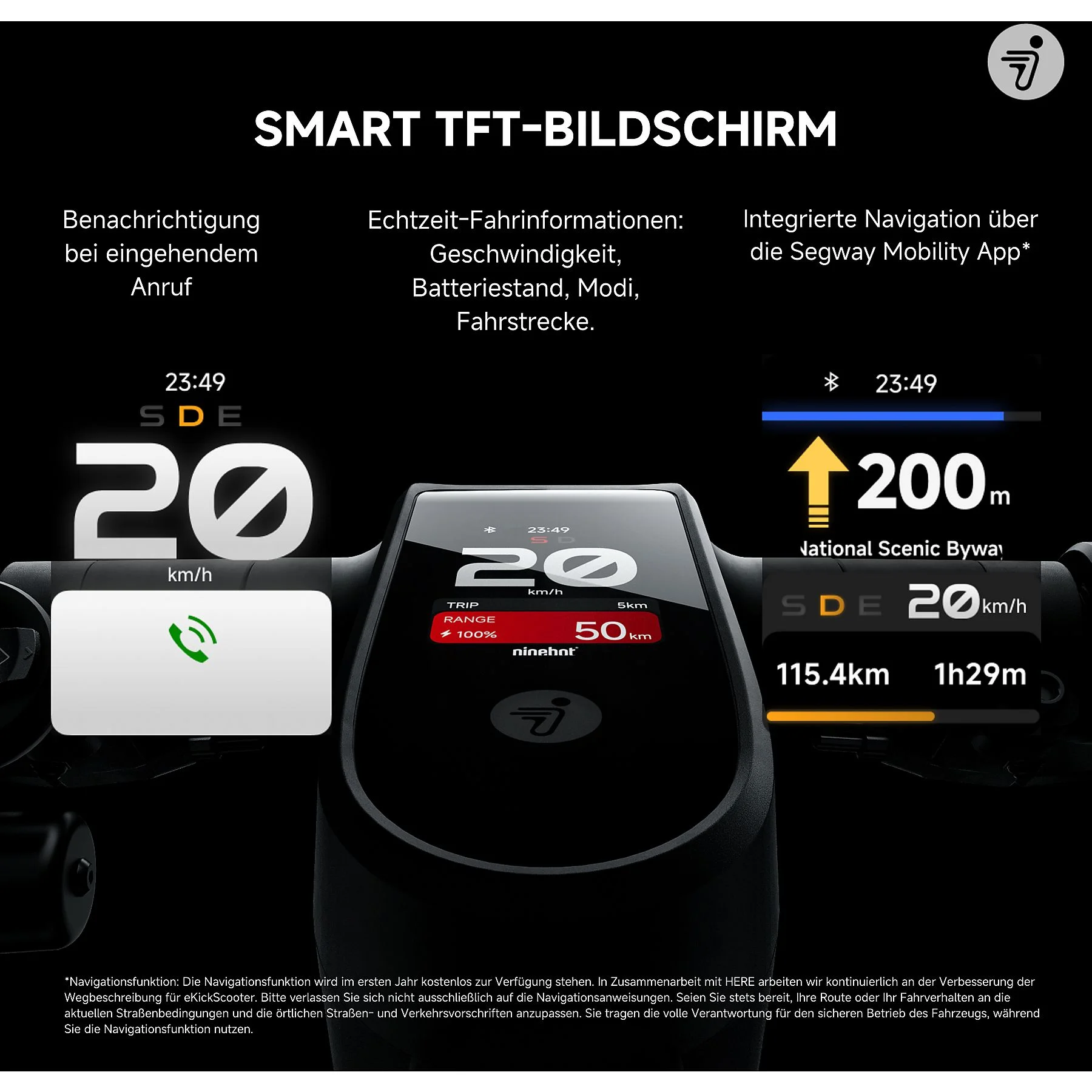 Der moderne TFT-Smart-Display zeigt alle wichtigen Informationen wie Geschwindigkeit, Akku, Modus und Reichweite an.