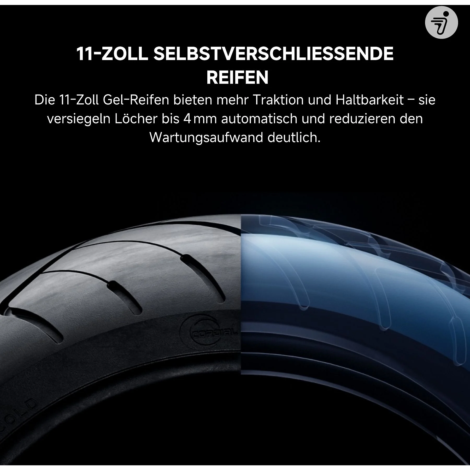 Die 11-Zoll selbstabdichtenden Reifen bieten optimalen Grip und zusätzliche Sicherheit bei Unebenheiten.